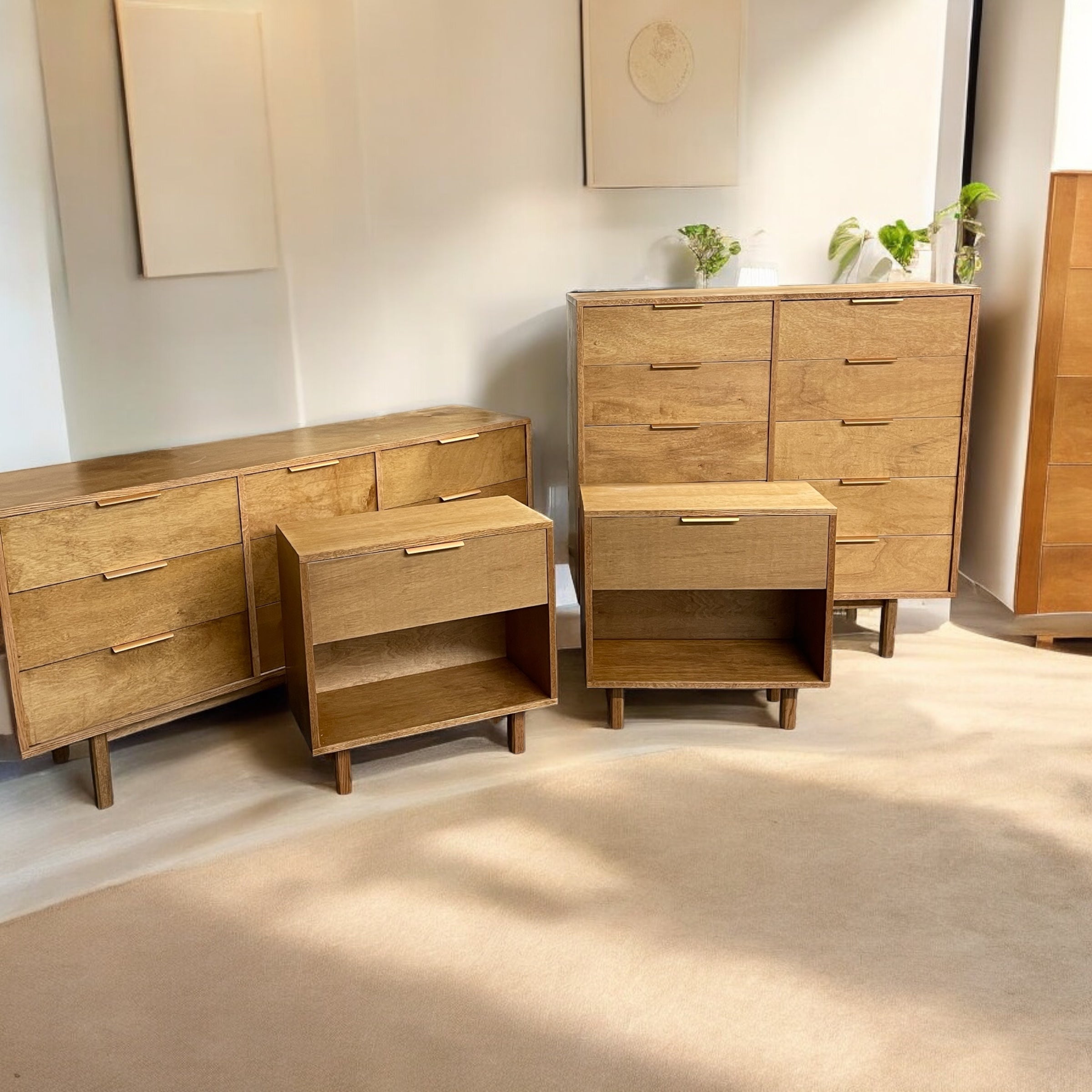 Elevate your bedroom with our sophisticated four-piece bedroom set, featuring two stylish nightstands, a classic dresser, and a tallboy dresser.
