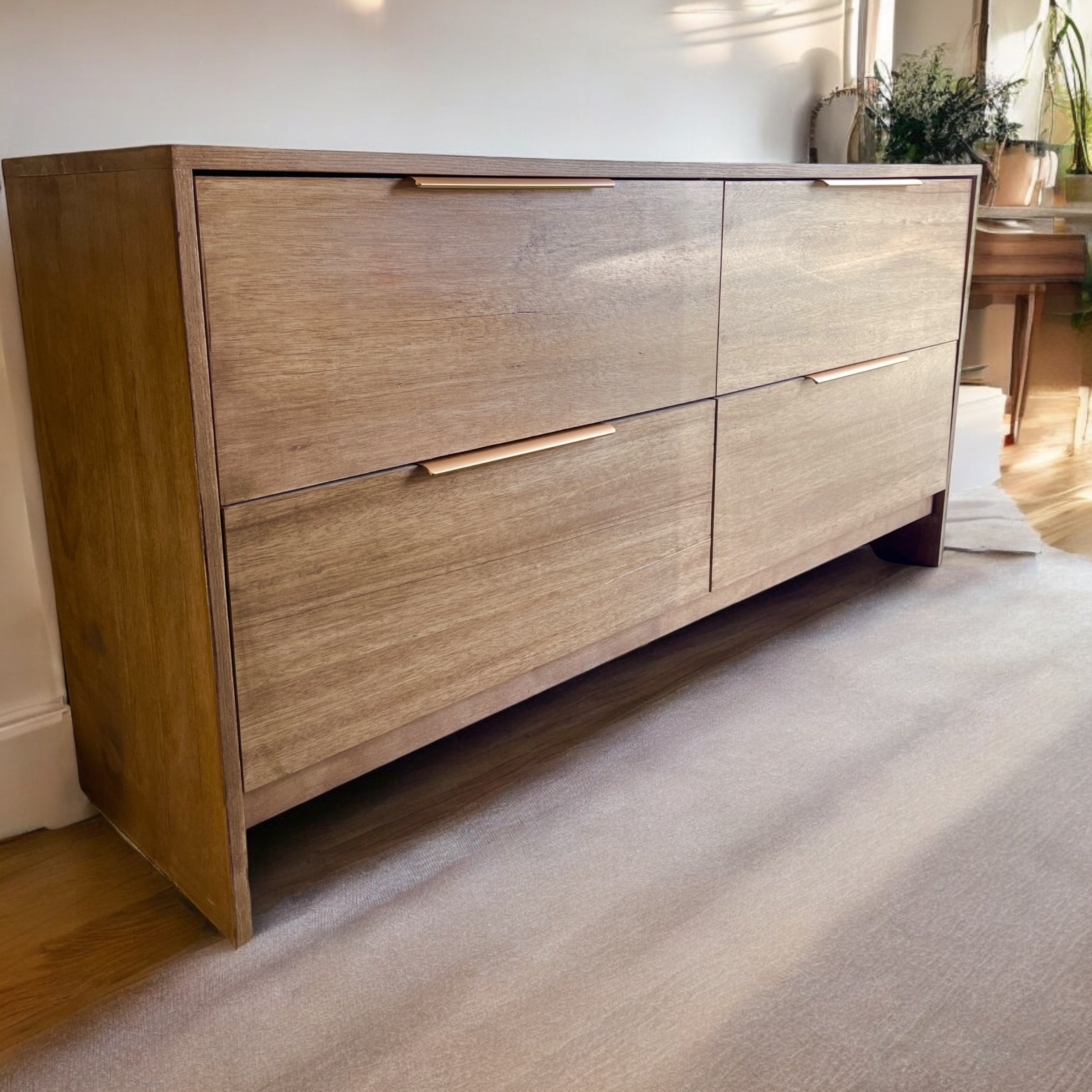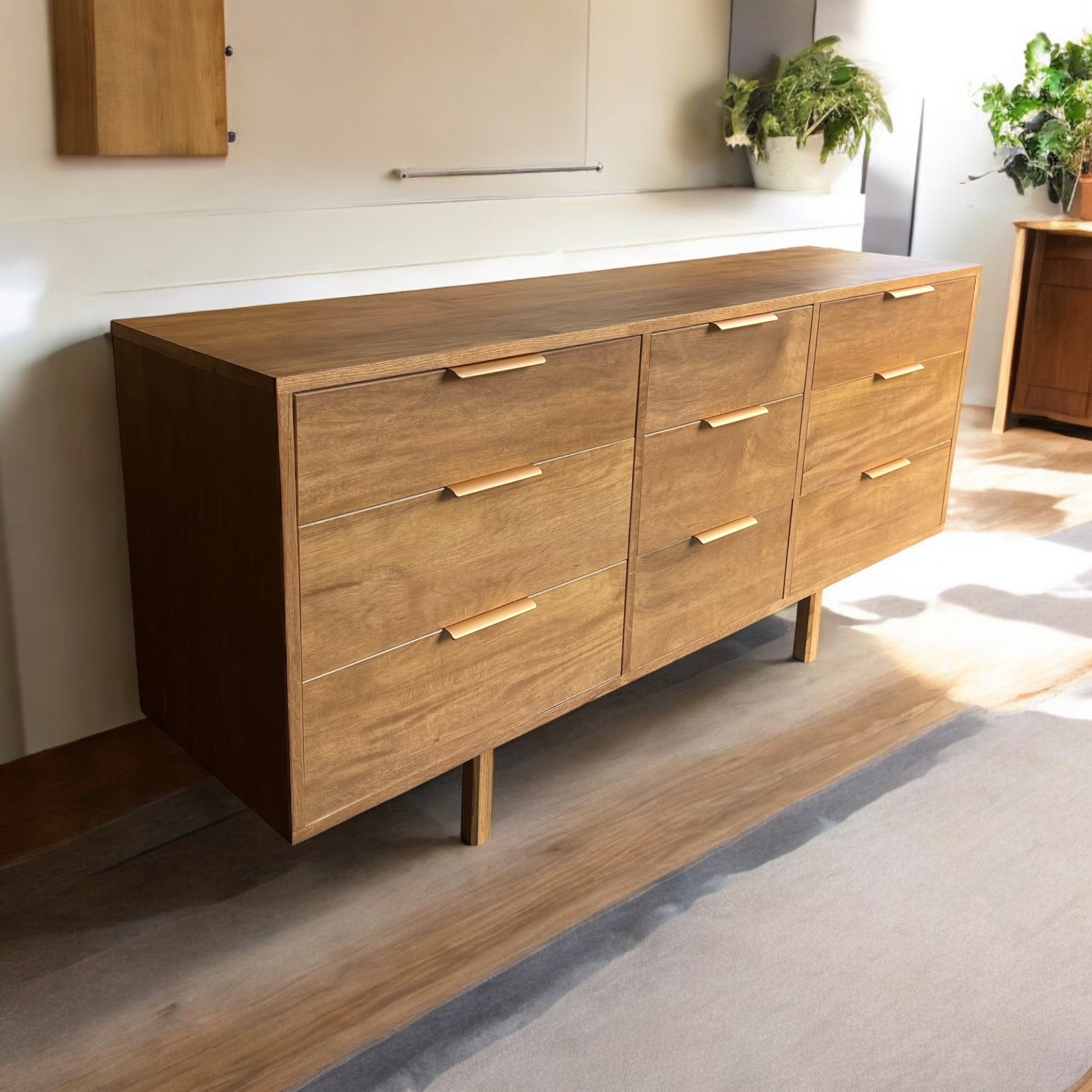 The dresser showcases a sophisticated design with clean lines and a minimalist profile.
